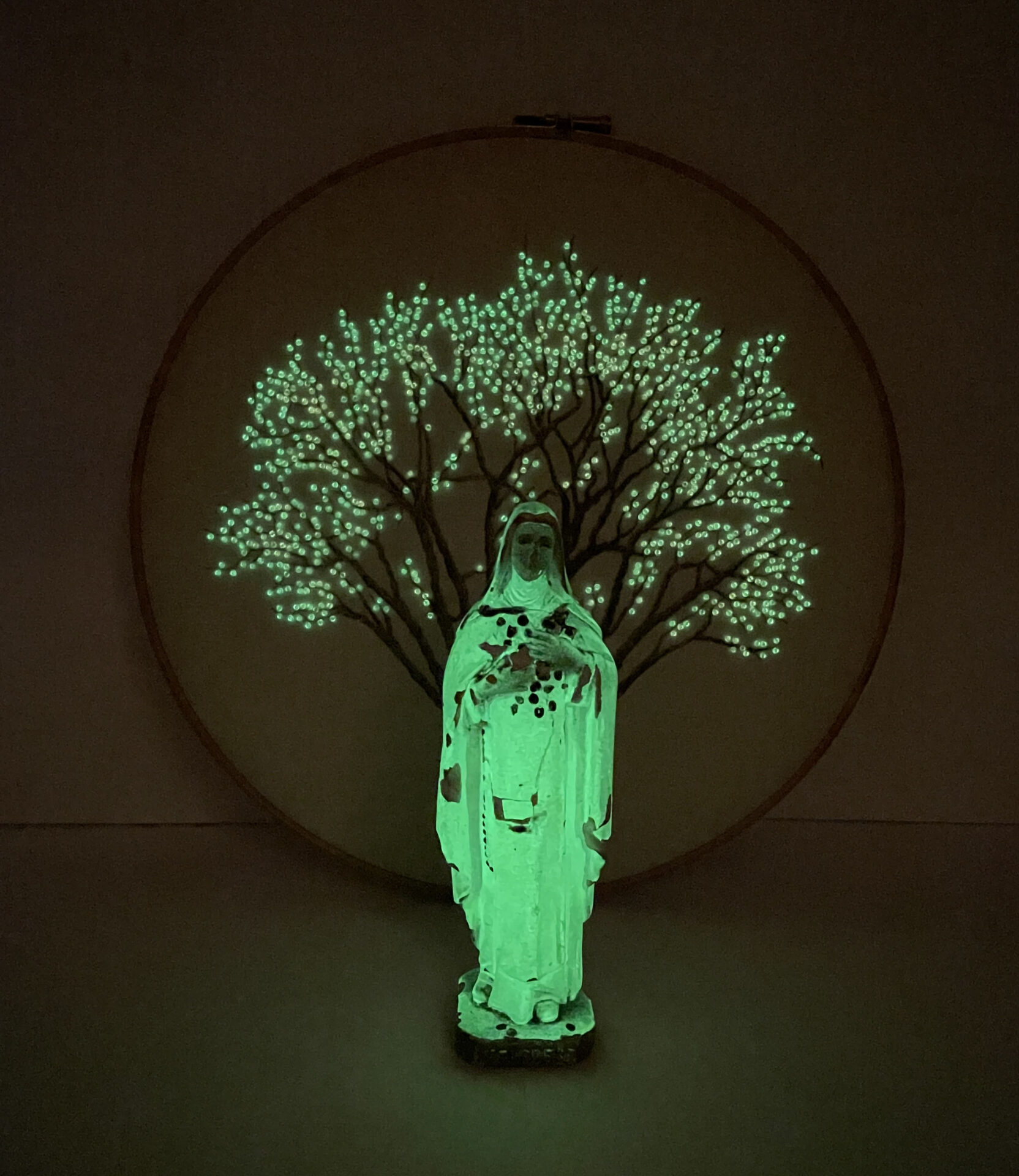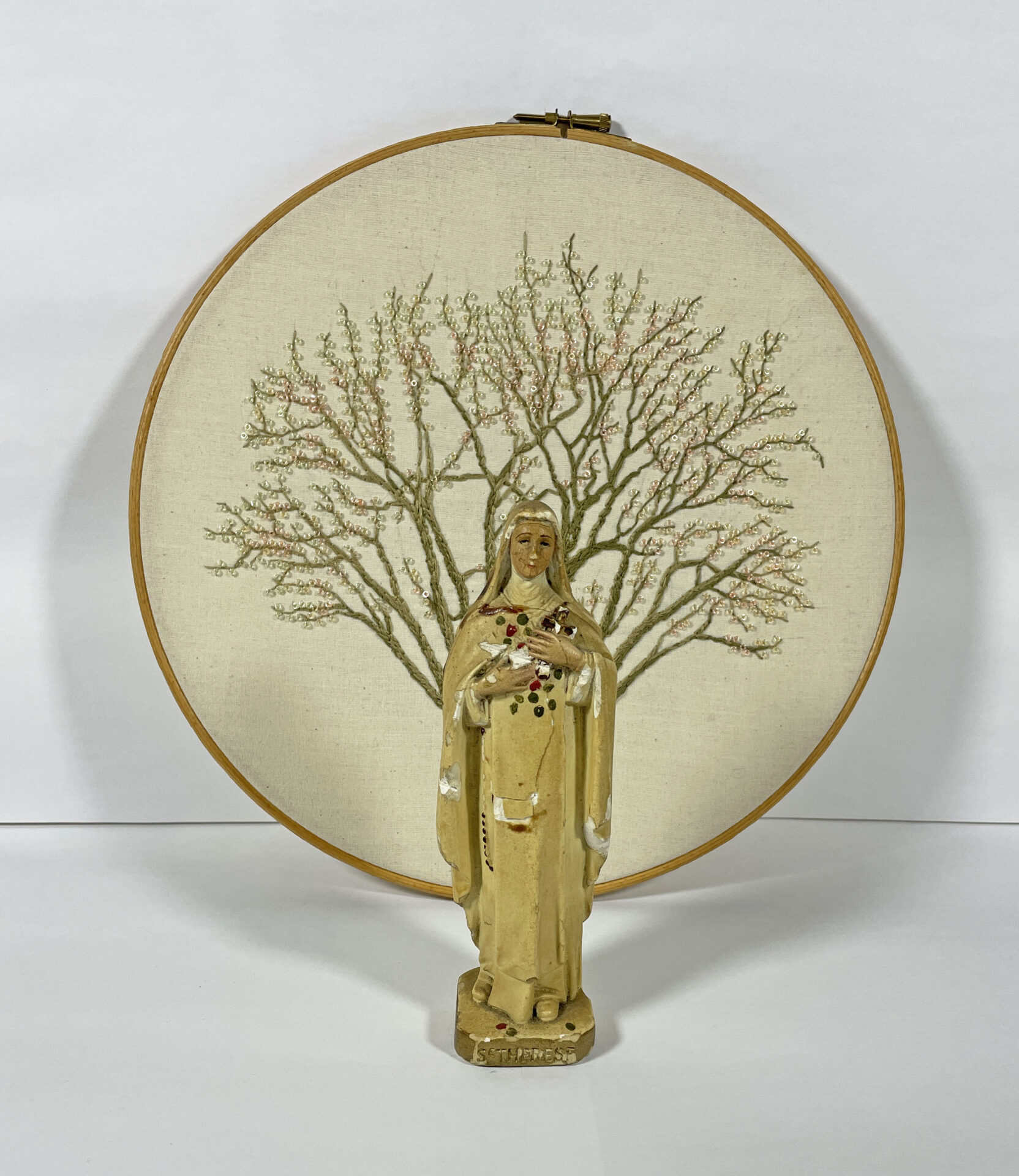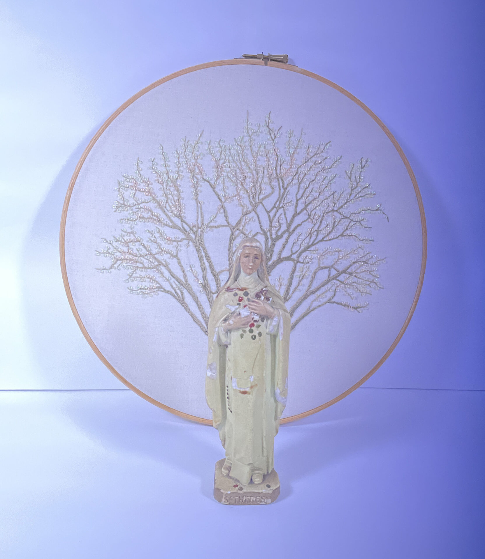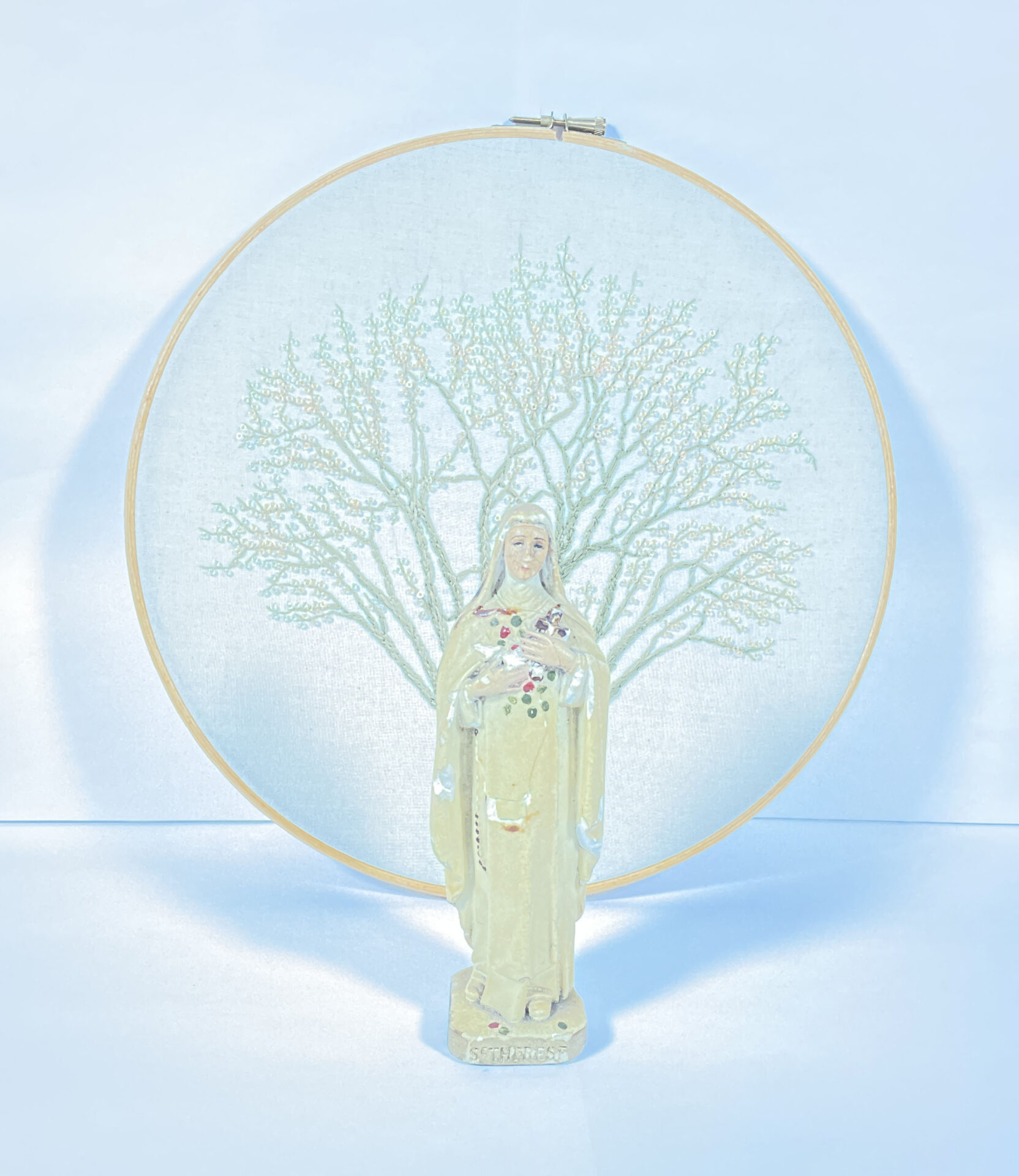 I embroidered a tree as a background for this figurine of Thérèse of Lisieux, or “de kleine Theresia” as I know her. She used to belong to my father, which is why she’s a bit nicotine stained. She also has some cracks from falling down and being glued back together again, but she still shines her light in the darkness.