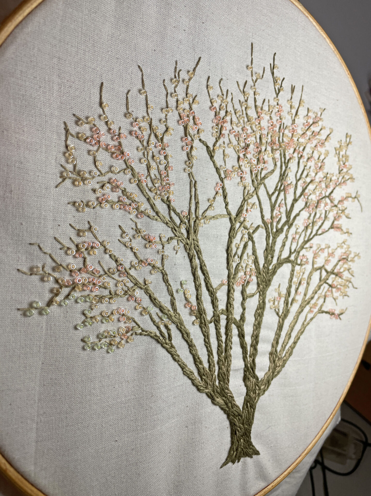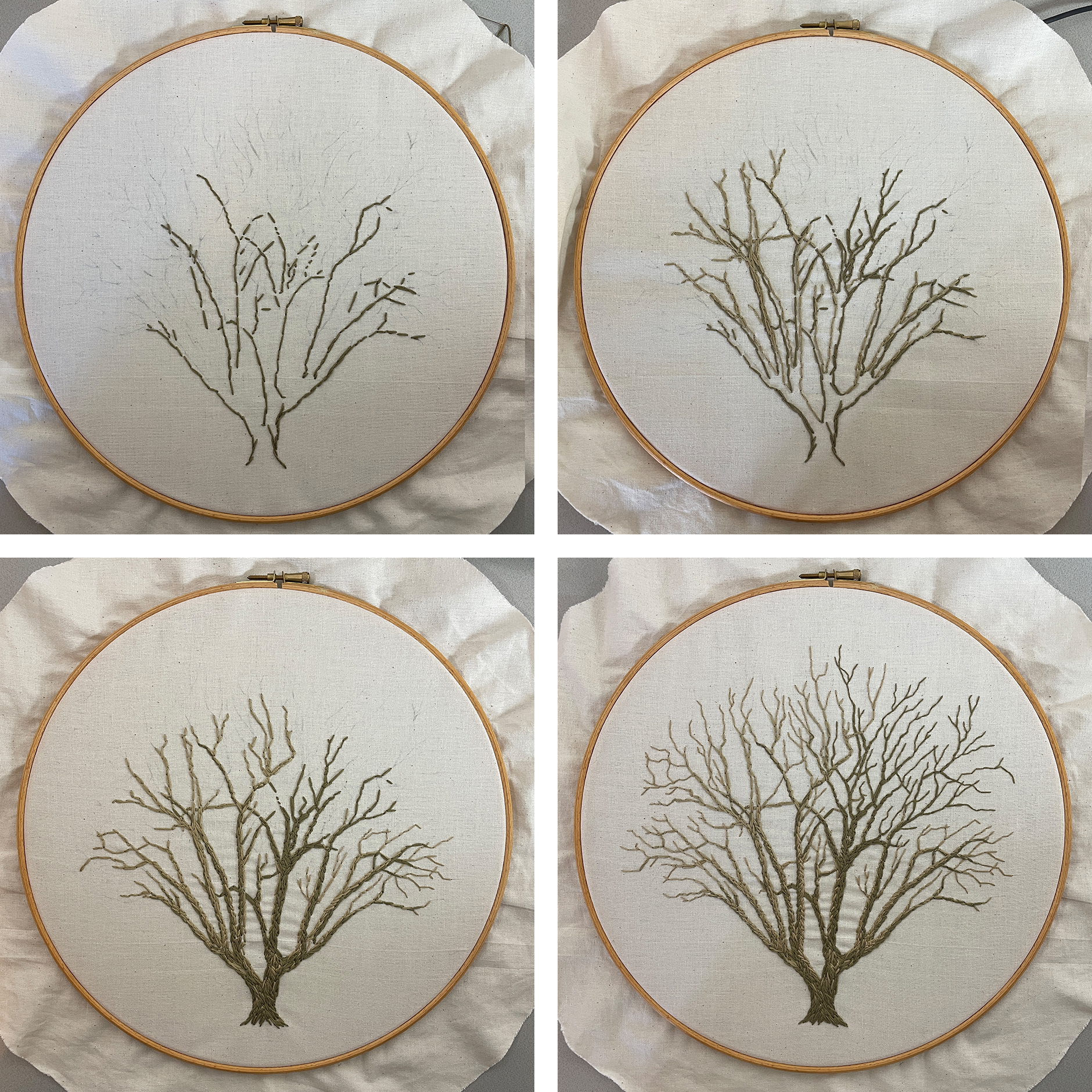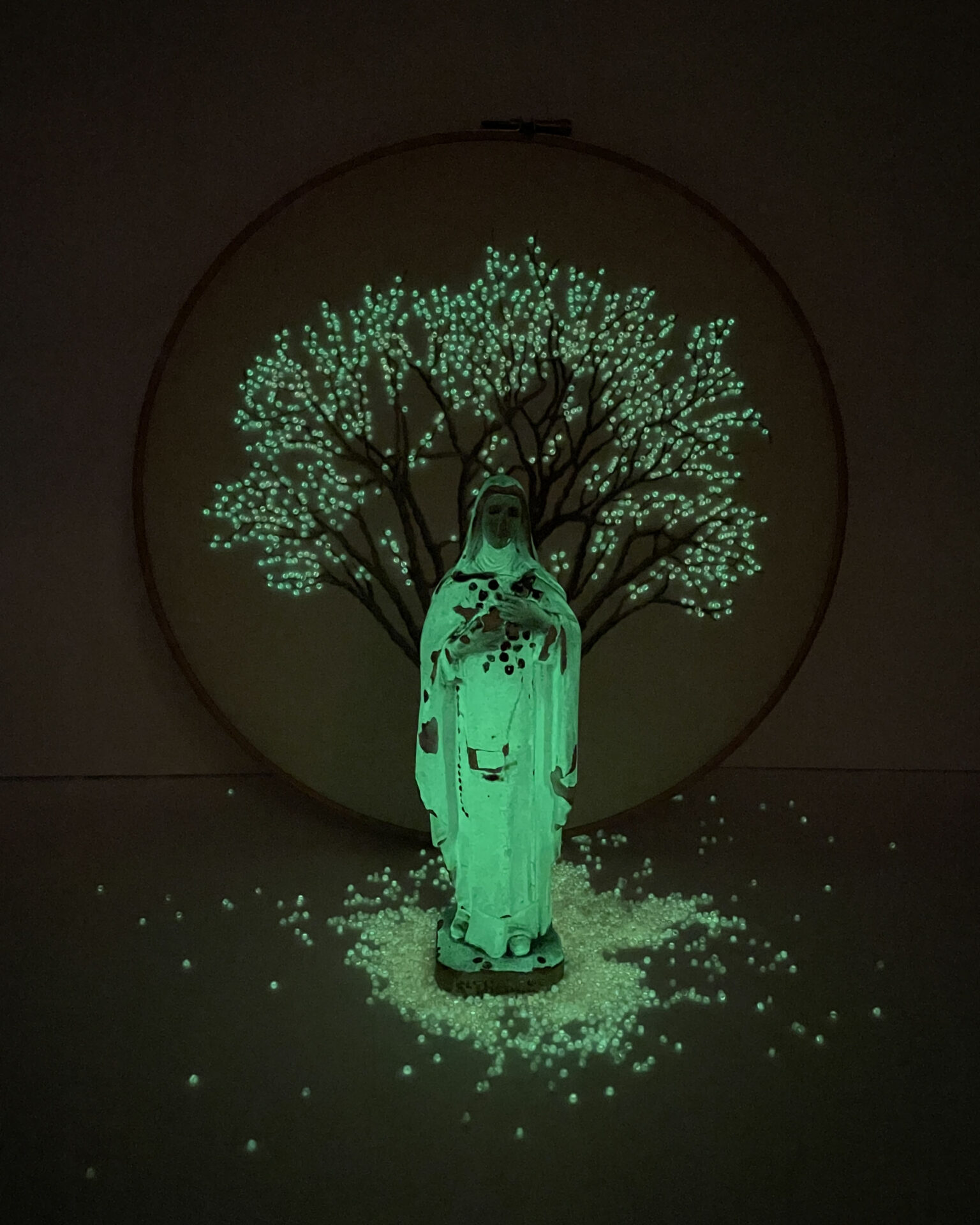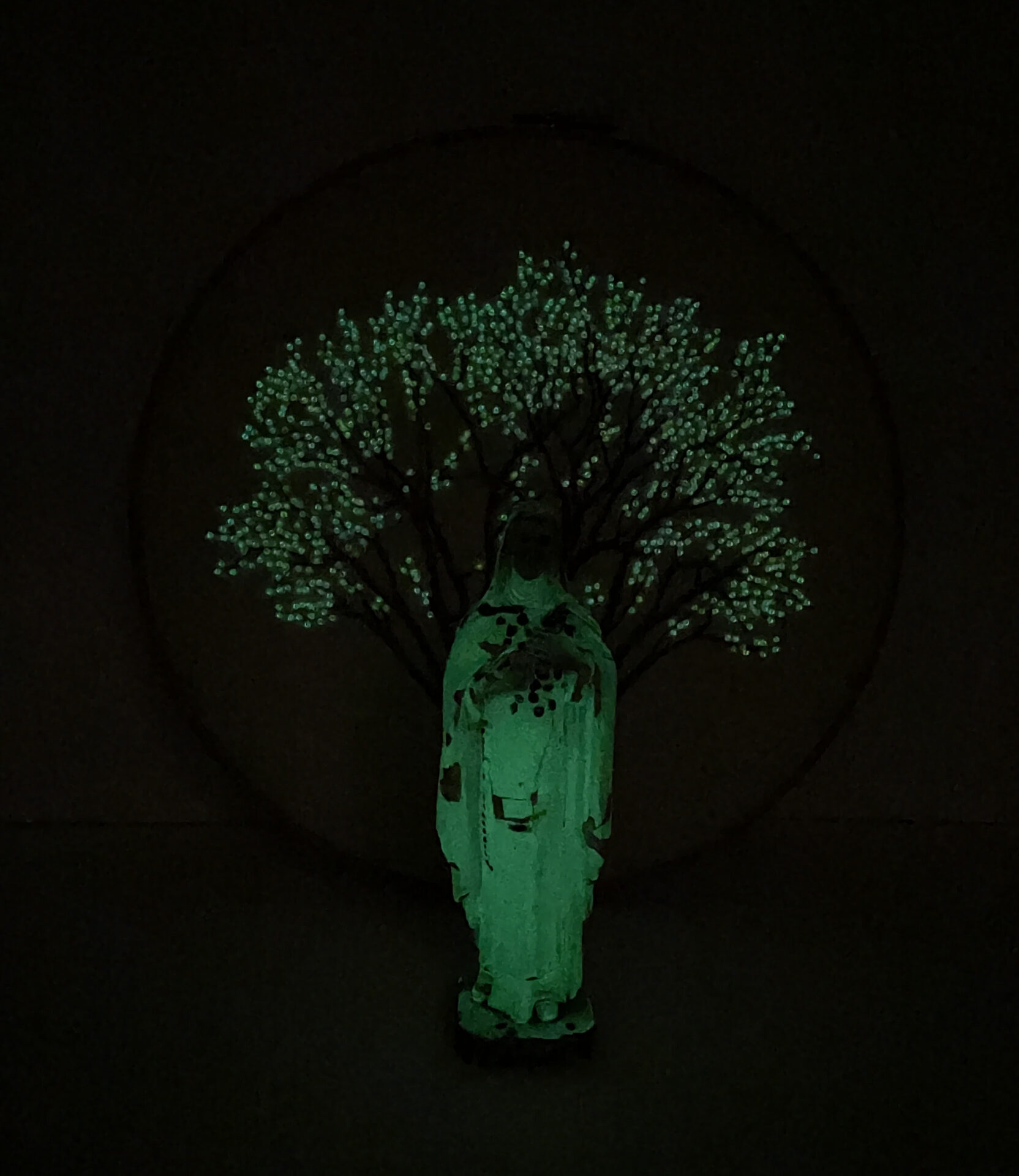 I embroidered a tree as a background for this figurine of Thérèse of Lisieux, or “de kleine Theresia” as I know her. She used to belong to my father, which is why she’s a bit nicotine stained. She also has some cracks from falling down and being glued back together again, but she still shines her light in the darkness.